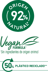 Fórmula vegana con 92% de ingredientes de origen natural.